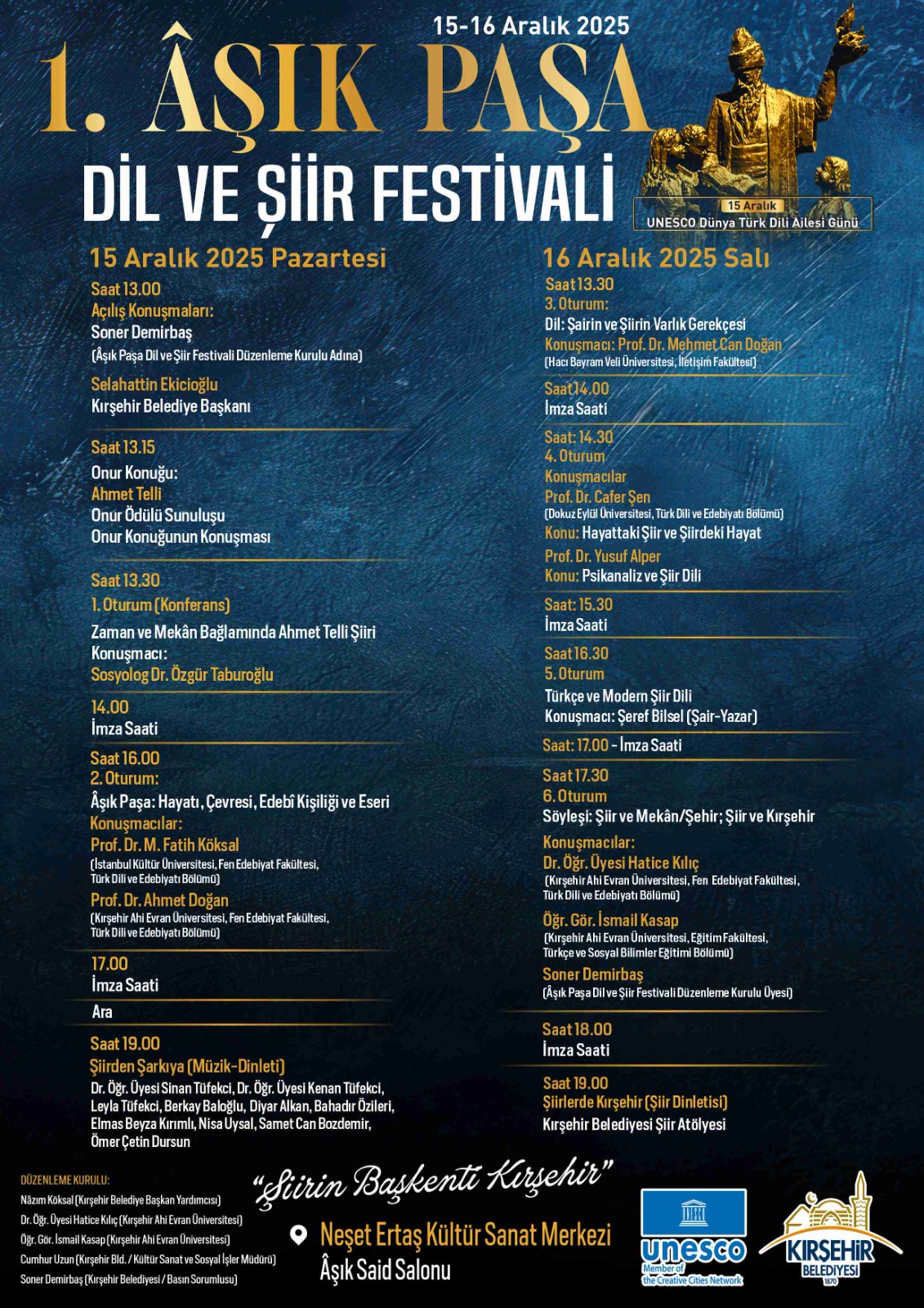 Kırşehir Belediyesi, UNESCO Dünya Türk Dili Ailesi Günü ile örtüşen “1. Âşık Paşa Dil ve Şiir Festivali” ile şehri şiirin ve Türkçenin yeni merkezine dönüştürüyor. Ünlü şair Ahmet Telli’nin de yer alacağı festival 15–16 Aralık’ta yapılacak.