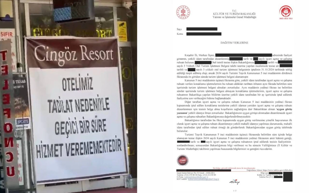 Kültür ve Turizm Bakanlığı, Cingöz Otel’e ait 3 yıldızlı turizm işletme belgesini 31 Ekim 2024 tarihinde iptal etti ve bu kararı işletme yönetimine tebliğ etti. Ancak, 2634 sayılı Turizmi Teşvik Kanunu’nun 5. maddesi uyarınca, işletme belirtilen süre içerisinde yeni bir turizm işletme belgesi almadı.