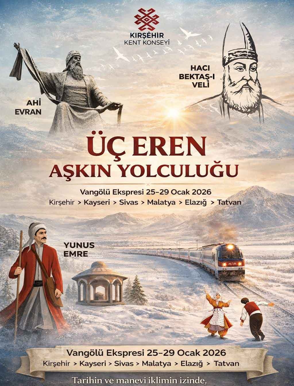 Kırşehir Kent Konseyi Kültür ve Turizm Çalışma Grubu, Kırşehir’in tarihi birikimini ve Ahilik kültürünü tanıtmak amacıyla Doğu Anadolu Bölgesi’ne yönelik yeni bir kültür turu düzenlemeye hazırlanıyor. “Üç Eren Aşkın Yolculuğu” temasıyla planlanan programın, Vangölü Ekspresi güzergâhında 25–29 Ocak 2026 tarihleri arasında gerçekleştirilmesi öngörülüyor.