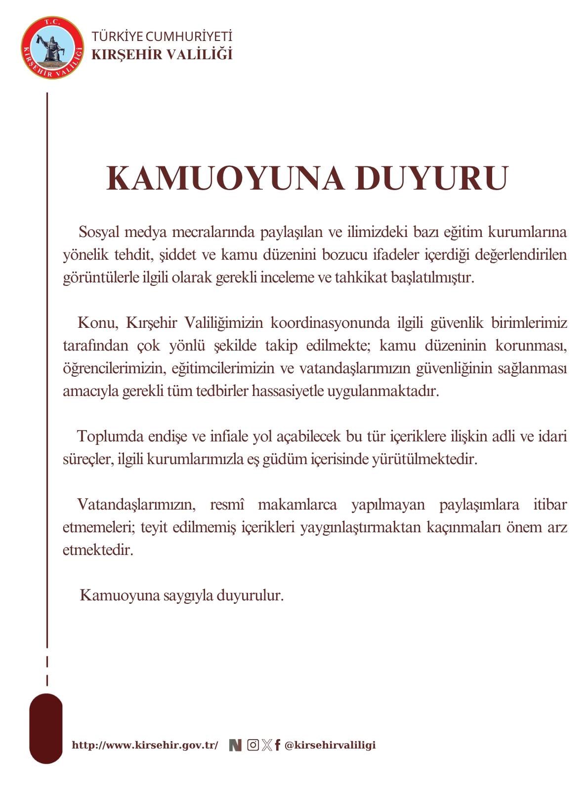 Valilik tarafından yapılan kamuoyu açıklamasında, söz konusu içeriklerin Kırşehir Valiliği koordinasyonunda ilgili güvenlik birimlerince çok yönlü olarak takip edildiği belirtildi. Açıklamada, kamu düzeninin korunması ile öğrencilerin, eğitimcilerin ve vatandaşların güvenliğinin sağlanması amacıyla gerekli tüm tedbirlerin hassasiyetle uygulandığı vurgulandı.