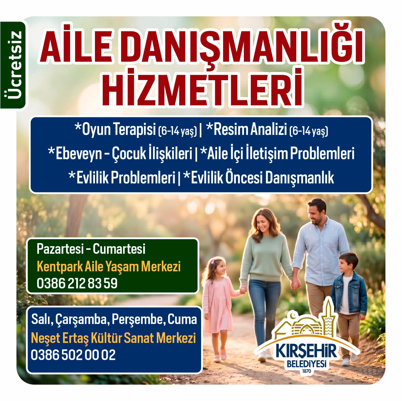 Kırşehir Belediyesi, sosyal belediyecilik anlayışı doğrultusunda aile yapısını destekleyen çalışmalarına devam ediyor. Bu kapsamda vatandaşlara yönelik ücretsiz Aile Danışmanlığı Hizmetleri sunuluyor.