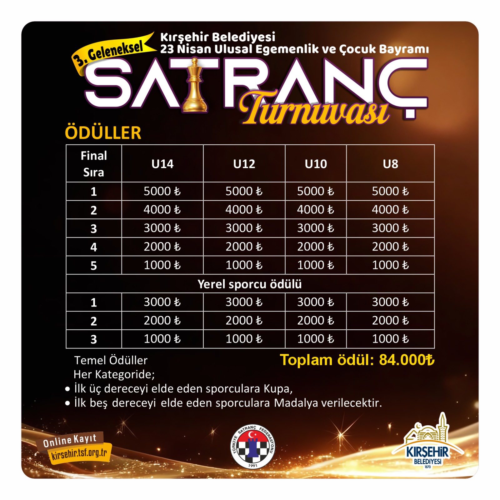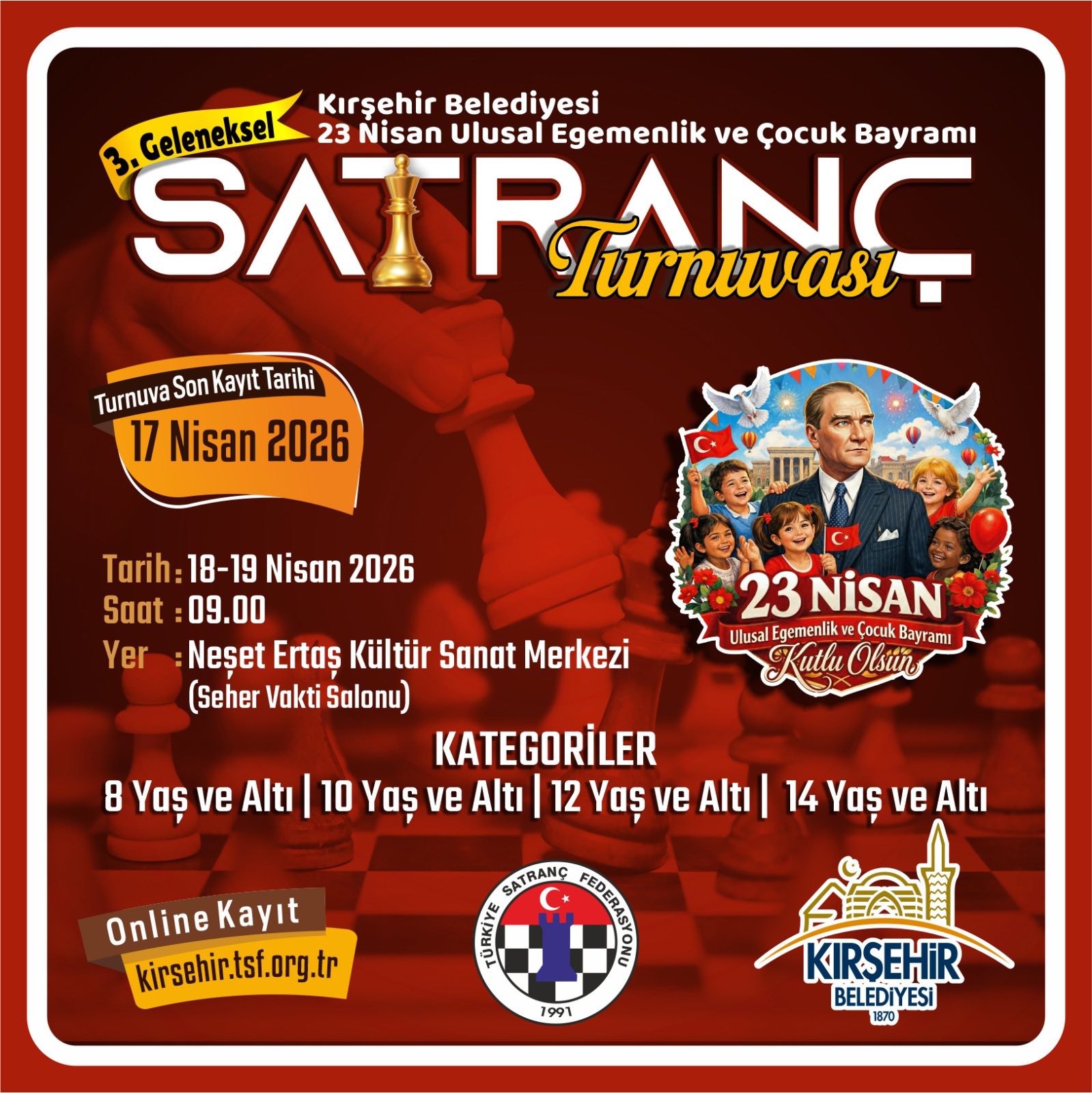 23 Nisan etkinlikleri kapsamında düzenlenecek bir diğer organizasyon ise 3. Geleneksel Satranç Turnuvası olacak. Turnuvanın son kayıt tarihi 17 Nisan 2026 olarak açıklanırken, müsabakalar 18-19 Nisan 2026 tarihlerinde saat 09.00’da Neşet Ertaş Kültür Sanat Merkezi Seher Vakti Salonu’nda oynanacak. Turnuva; 8 yaş ve altı, 10 yaş ve altı, 12 yaş ve altı ile 14 yaş ve altı olmak üzere dört ayrı kategoride düzenlenecek. Başvurular ise çevrim içi olarak kirsehir.tsf.org.tr adresinden yapılabilecek.