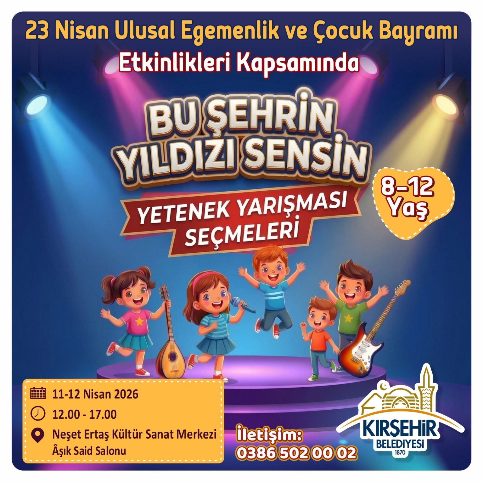 Etkinlik takviminin ilk ayağında, “Bu Şehrin Yıldızı Sensin” Yetenek Yarışması seçmeleri yapılacak. 8-12 yaş grubuna yönelik seçmeler, 11-12 Nisan 2026 tarihlerinde saat 12.00 ile 17.00 arasında Neşet Ertaş Kültür Sanat Merkezi Aşık Said Salonu’nda gerçekleştirilecek. Organizasyona katılmak isteyenler, 0386 502 00 02 numaralı iletişim hattından bilgi alabilecek.