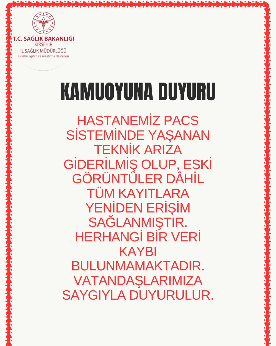 “ PACS sisteminde yaşanan teknik arıza giderilmiş olup, eski görüntüler dâhil tüm kayıtlara yeniden erişim sağlanmıştır. Herhangi bir veri kaybı bulunmamaktadır. Vatandaşlarımıza saygıyla duyurulur.”