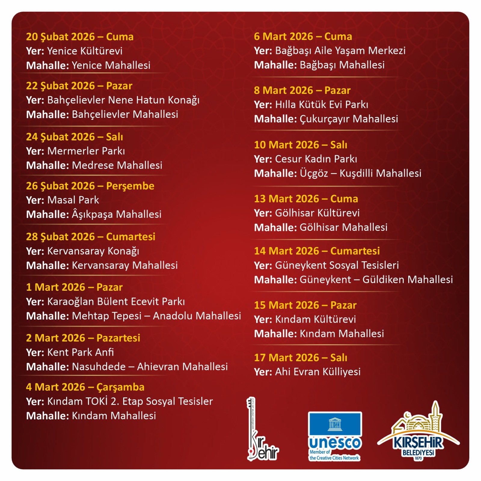 Kırşehir Belediyesi tarafından düzenlenen “Ramazan Etkinlikleri”, 20 Şubat–17 Mart 2026 tarihleri arasında kentin farklı mahallelerinde saat 20.30’da vatandaşlarla buluşacak. Programda Karagöz–Hacivat, davul-zurna gösterisi, orta oyunu, karaoke ve canlı müzik yer alırken; mısır, pamuk şeker, lokma ve ramazan şerbeti ikramı yapılacak.