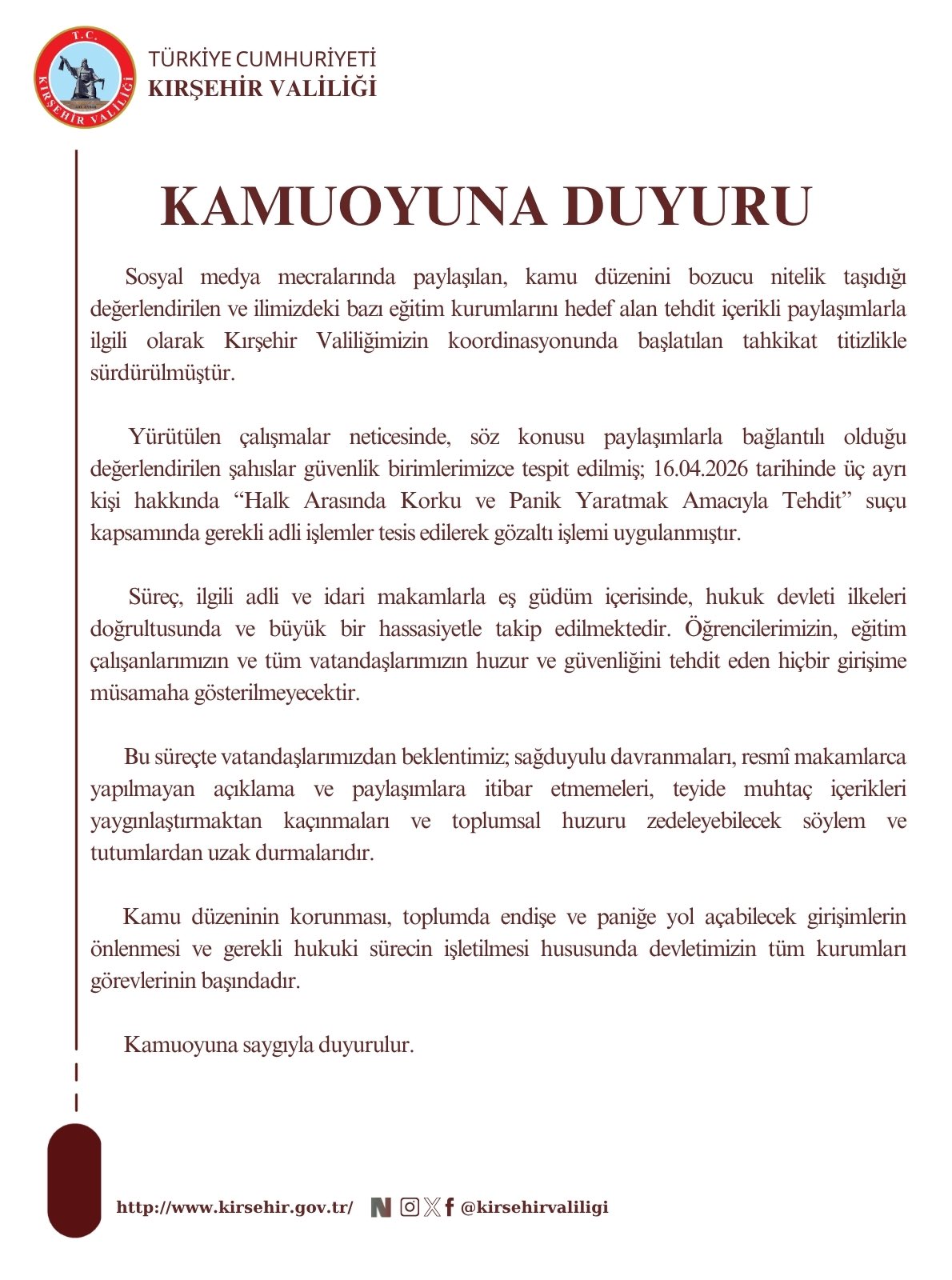 Kırşehir Valiliği, kamu düzeninin korunması, toplumda endişe ve paniğe yol açabilecek girişimlerin önlenmesi ve gerekli hukuki sürecin işletilmesi konusunda devletin tüm kurumlarının görev başında olduğunu belirterek, gelişmelerin kamuoyuyla paylaşılacağını bildirdi.