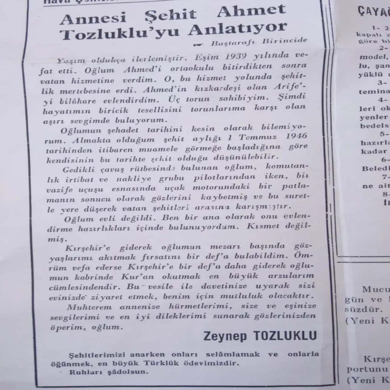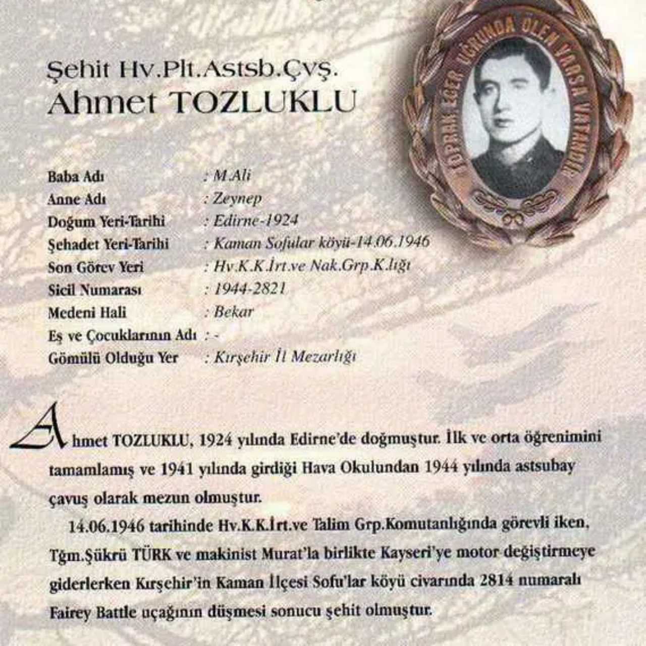 Kırşehir’de Ankara–Kayseri Karayolu’nun yanında bulunan şehitliğe adını veren Şehit Hava Pilot Astsubay Çavuş Ahmet Tozluklu’nun 1946’daki görev uçuşu, tanıklıklar ve belgeler ışığında yeniden anlatıldı.
