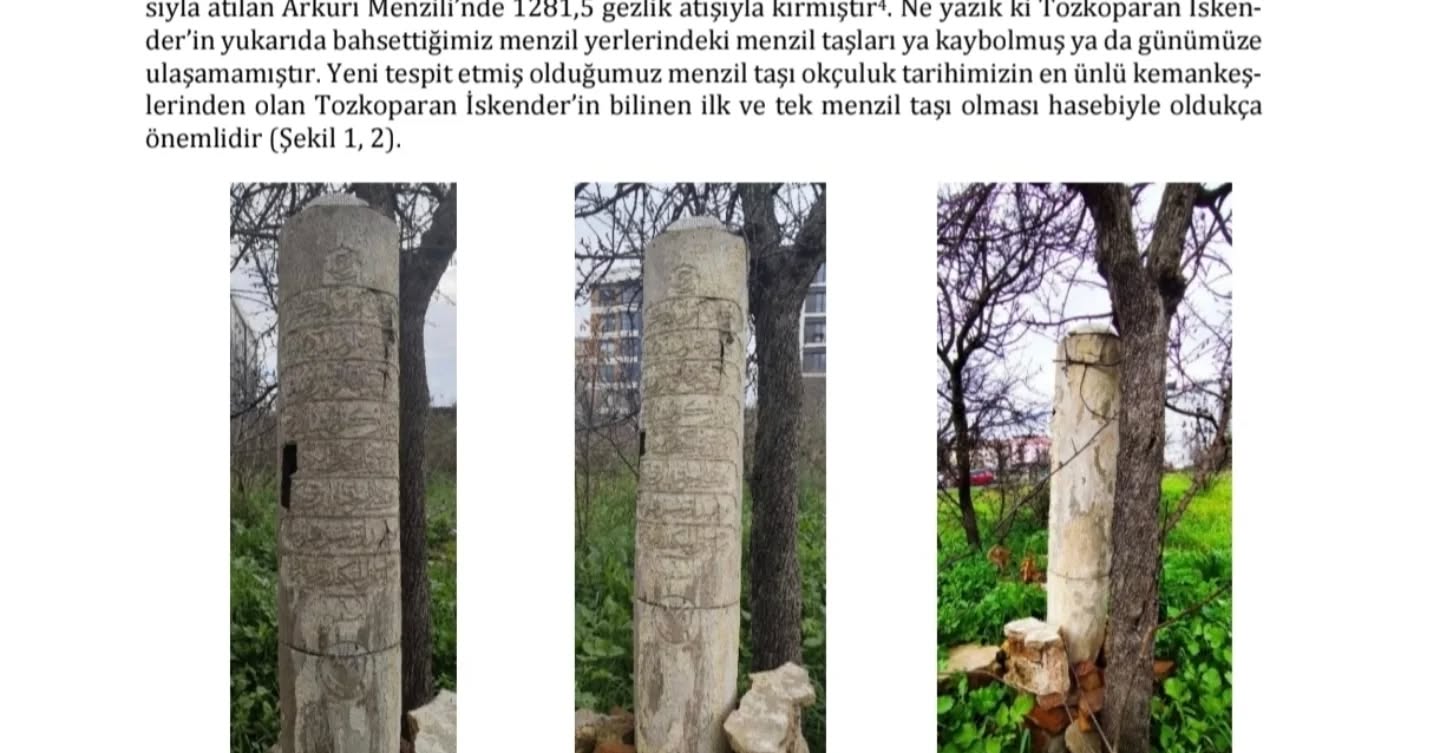 İkili, İstanbul Tuzla ilçesi Merkez Mahallesi’nde bulunan söz konusu objenin, Türk okçuluğunun en tanınmış kemankeşlerinden Tozkoparan İskender’e ait bilinen ilk ve tek menzil taşı olabileceğini öne sürdü. Makalede, eserin ahşaptan yapılmış olmasının sıra dışı bir özellik taşıdığı belirtilirken, toprağa gömülü olmadan taş ve tuğlalarla desteklenerek ayakta tutulduğu bilgisine de yer verildi.