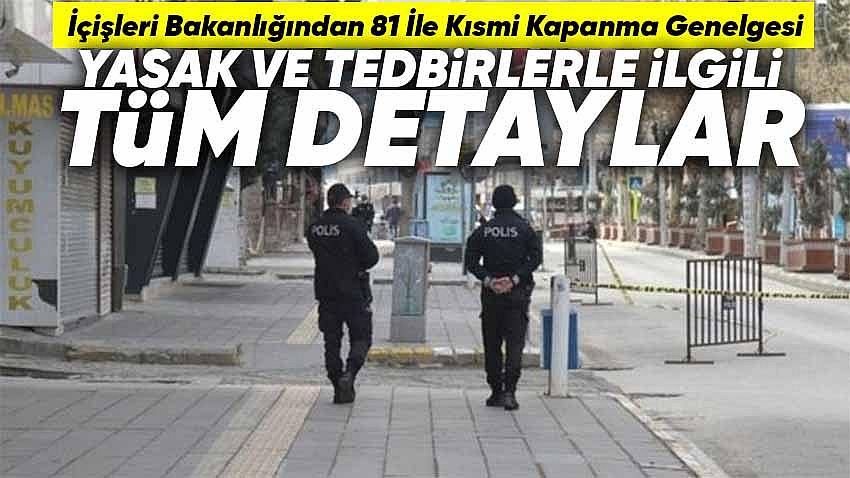 İçişleri Bakanlığı 81 il valiliğine Kovid-19 tedbirleri kapsamında "Kısmi Kapanma" konulu genelge gönderdi. Genelgede hafta sonu sokak kısıtlamasının cuma 19.00'dan pazartesi 05.00'e kadar olduğu belirtildi. Sokağa çıkma kısıtlama sürelerine uyum için istisnalar haricinde iş yerleri hafta içi 07.00-18.00 saatleri arası açık olabilecek. Sokak kısıtlaması olan günlerde şehirler arası seyahatlere izin verilmeyeceği belirtilen genelgede; zorunlu haller sayılacak durumlar madde madde sıralandı.