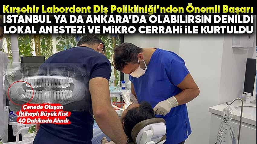 Kırşehir'de açıldığı günden bu yana diş tedavisi alanında getirdiği yenilikler ve verdiği kaliteli hizmetlerle adından söz ettiren Labordent Diş Polikliniği, uygulamaya başladığı çene cerrahisi ile diş tedavisi alanına yeni bir boyut kazandırdı.Çenesinde ve yüzünde oluşan şiddetli ağrı şikayetiyle Labordent Diş Polikliniği'ne başvuran 35 yaşındaki hastanın çekilen diş tomografisinde damak altında kalan ve çıkmayan 20'lik dişin arka kısmında çene altı ve çene eklemine kadar uzanan iltihaplı bir kist tespit edildi.