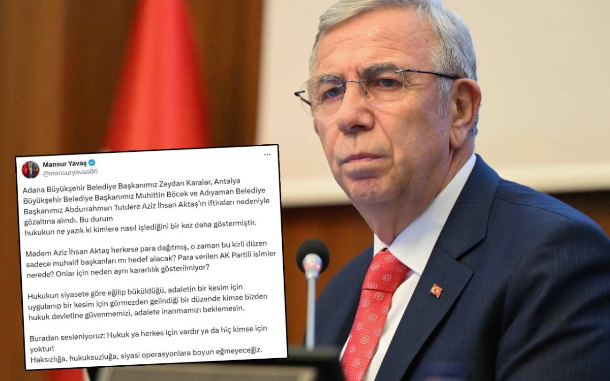 Mansur Yavaş açıklamasında, gözaltıların merkezindeki isim olarak gösterilen Aziz İhsan Aktaş’ın sadece muhalif belediye başkanlarıyla ilişkilendirildiğini hatırlatarak, “Madem herkes para almış, o halde neden sadece muhalif isimler hedefte? AK Partili isimler için neden aynı hassasiyet gösterilmiyor?” sorusunu yöneltti.