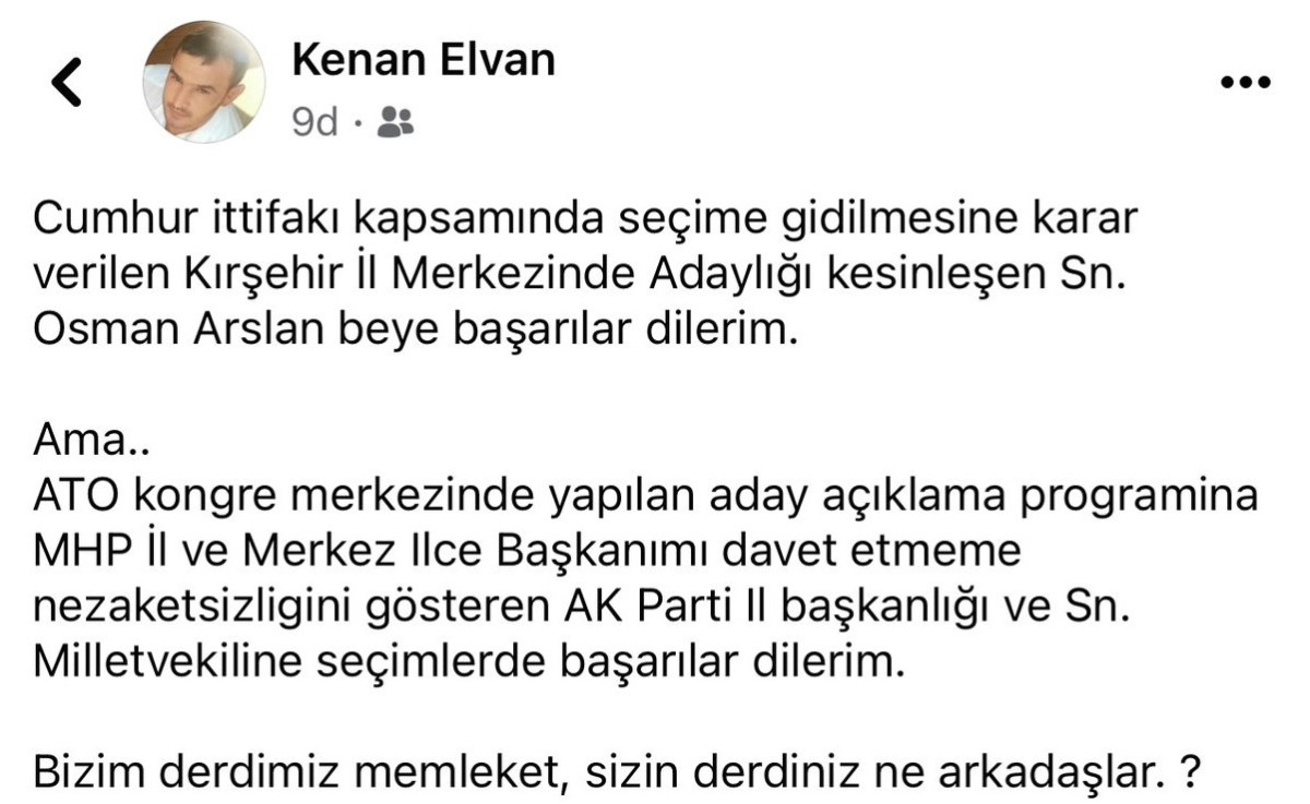 Milliyetçi Hareket Partisi Kaman İlçe Başkanı Kenan Elvan, sosyal medya hesabından AK Parti'ye tepki gösterdi.