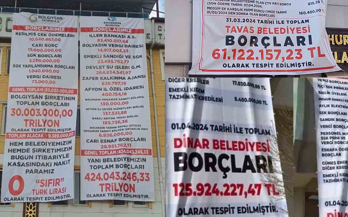 AK Parti'den MHP’ye geçen Afyonkarahisar Bolvadin Belediyesi’nin yeni başkanı Derviş Aynacı, önceki dönemden kalan borçların yer aldığı pankartı belediye binasına astı. Belediye kasasında “sıfır” lira kaldığı belirtilen pankartta, önceki yönetimden 424 milyonluk borç olduğu bilgisi yer aldı.