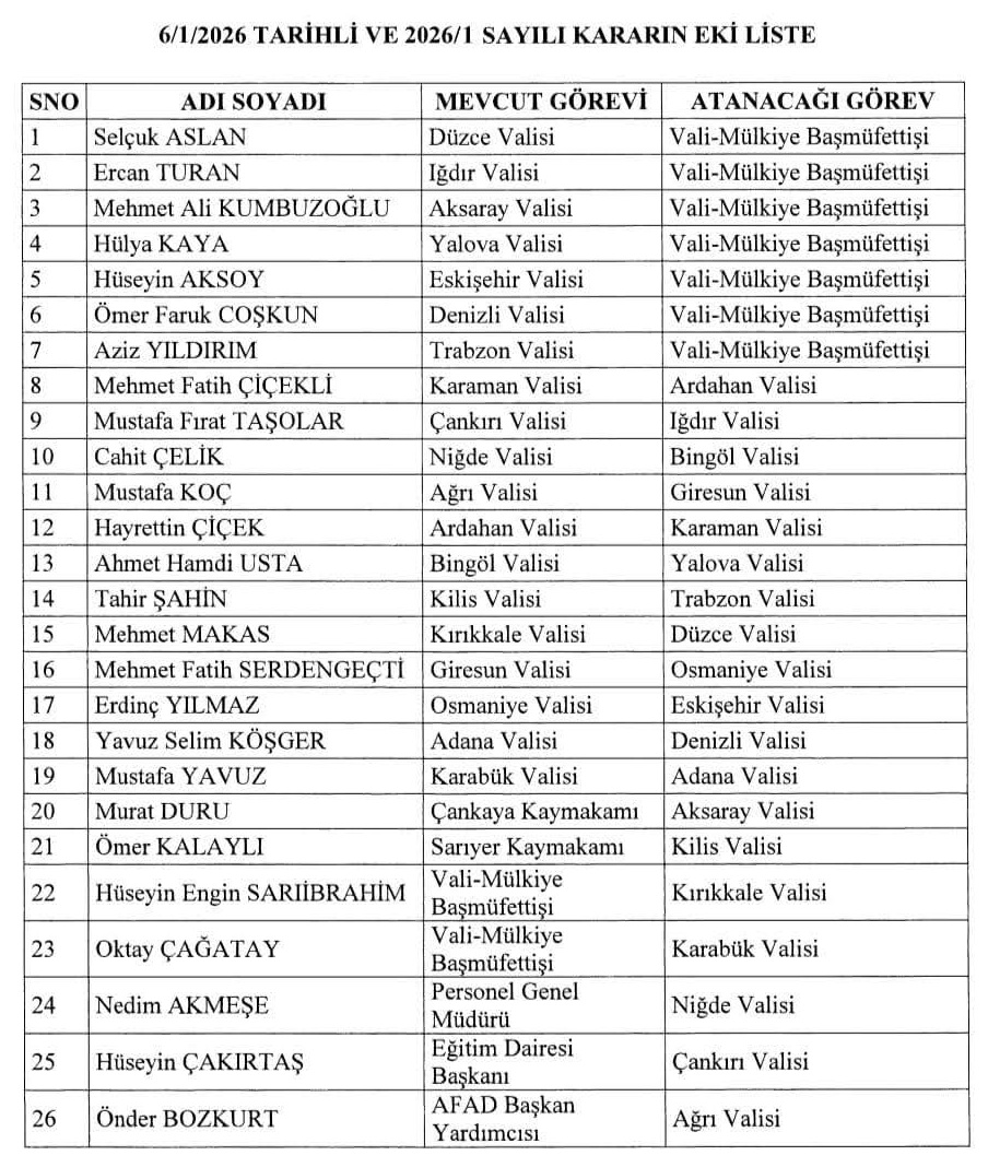 Cumhurbaşkanı Recep Tayyip Erdoğan’ın imzasıyla Resmi Gazete’de yayımlanan kararnameyle mülki idarede kapsamlı görev değişiklikleri yapıldı. Kararname kapsamında 7 ilin valisi “vali-mülkiye başmüfettişliği” görevine atanırken, 19 ile yeni vali görevlendirildi.