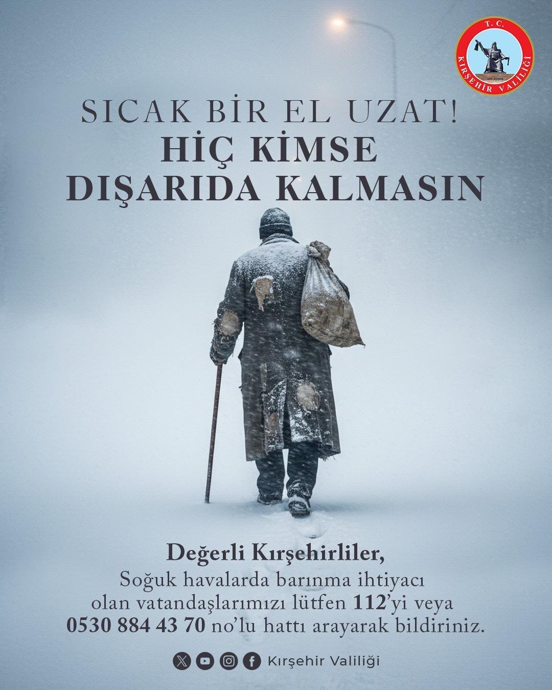 Kırşehir Valiliği, “Sıcak bir el uzatmak, soğuk bir gecede umuda dönüşebilir” mesajıyla tüm Kırşehirlileri duyarlı olmaya davet ederken, kış şartlarının ağırlaştığı bu günlerde sosyal sorumluluk bilincinin hayati önem taşıdığına dikkat çekti.