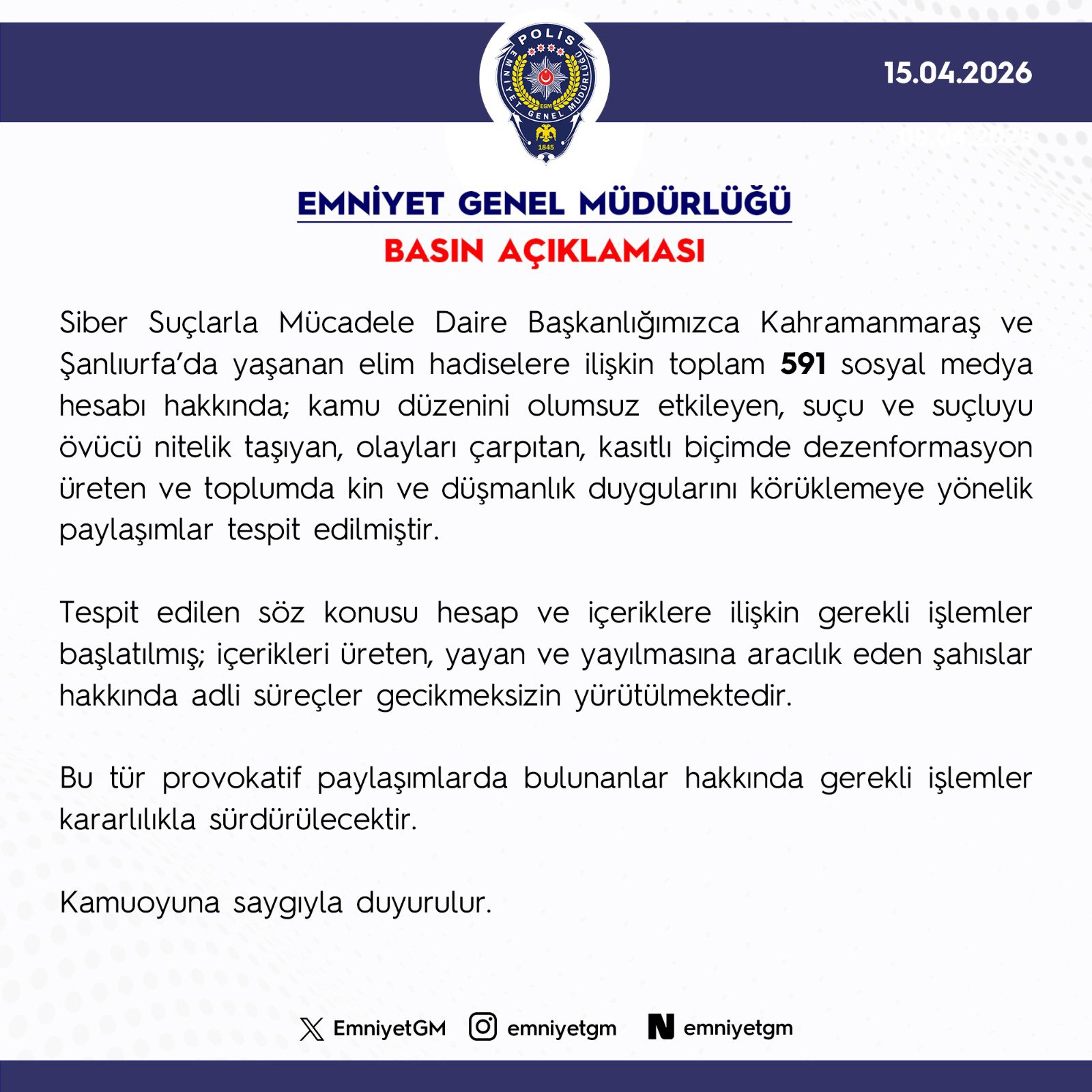 Emniyet Genel Müdürlüğü de konuya ilişkin yaptığı açıklamada, Siber Suçlarla Mücadele Daire Başkanlığı tarafından Kahramanmaraş ve Şanlıurfa’daki olaylara dair sosyal medya paylaşımlarının incelendiğini bildirdi. Açıklamada, kamu düzenini olumsuz etkileyen, suçu ve suçluyu övücü nitelik taşıyan, olayları çarpıtan, kasıtlı biçimde dezenformasyon üreten ve toplumda kin ile düşmanlığı körüklemeye yönelik içerikler paylaşan toplam 591 sosyal medya hesabının tespit edildiği aktarıldı.