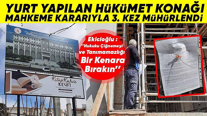 Yurda dönüştürüldüğü için Kırşehir Kamuoyunun büyük tepkisini çeken hükümet konağı inşaatı, mahkeme kararıyla 3. kez mühürlendi.Çevre ve şehircilik İl Müdürlüğü'nün gerekli plan tadilatları yapılmadan hukuka aykırı şekilde ruhsatlandırma yaptığını belirten Kırşehir Belediye Başkanı Selahattin Ekicioğlu, '' Kanunda yurt olarak yapılamaz diye ibare var.Biz de mahkeme kararıyla inşaatı 3. kez mühürledik'' dedi.