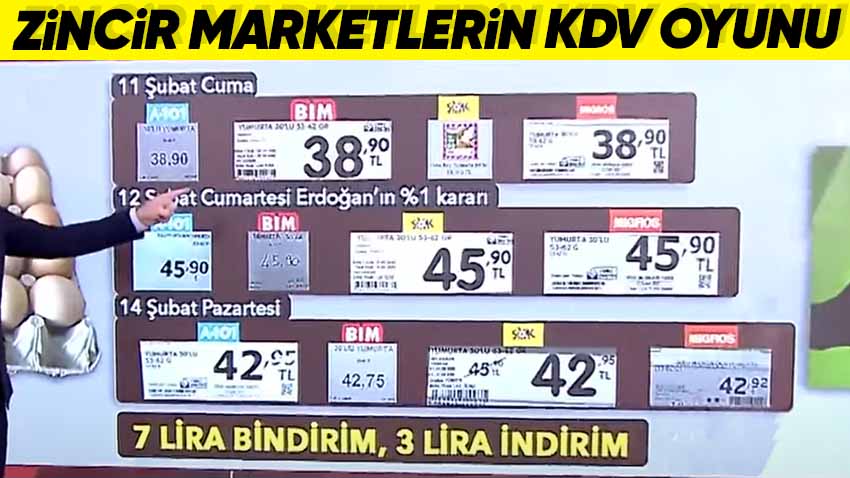 Marketlerin KDV oyununu dün ''Önce Bindirim Sonra İndirim'' diye gündeme getirmiştik.Temel gıda ürünlerinde yüzde 8 olan KDV'nin yüzde 1'e çekilmesi ile birlikte tüm gözler marketlere çevrilmişti.Ancak marketler sözde indirim adı altında temel gıda ürünlerine zam yaptılar.Pazartesi günü KDV indiriminin devreye girmesiyle birlikte göstermelik indirim yaparak enflasyonla mücadele için devreye sokulan KDV indirimi uygulamasını bir anlamda By-Pass ettiler.Hatta indirim yerine fiyatlara zam yaptılar.TGRT Haber sunucusu Ekrem Açıkel de zincir marketlerin KDV oyununu programında gündeme getirdi.